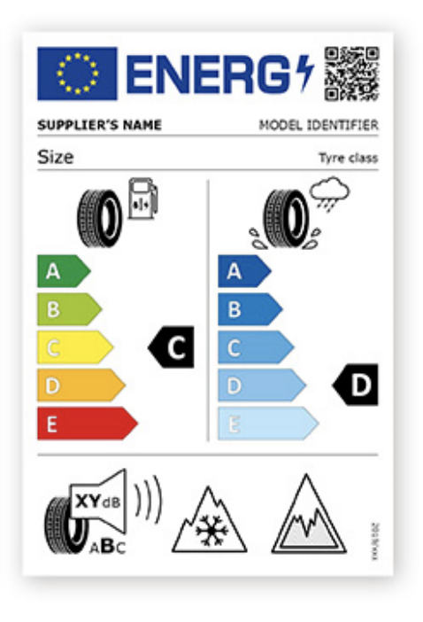 Rolling resistance and wet grip classes will be shown, as well as noise classes (A, B, and C). The new EU tyre label includes more information about tyre performance in snow and ice conditions, also known as ‘Snow Grip’ and ‘Ice Grip’. The label classes for wet grip and rolling resistance now include 5 instead of 7, denoted by the letters A through E. Tyres that would previously be placed in Class E will now be in the new Class D, and tyres from the old Class F & G will merge to form the new Class E.