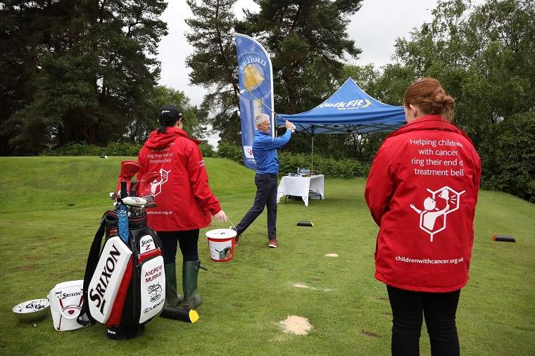 Ex-European Open champion Andrew Murray tees off under the watchful eyes of the Children with Cancer UK team.